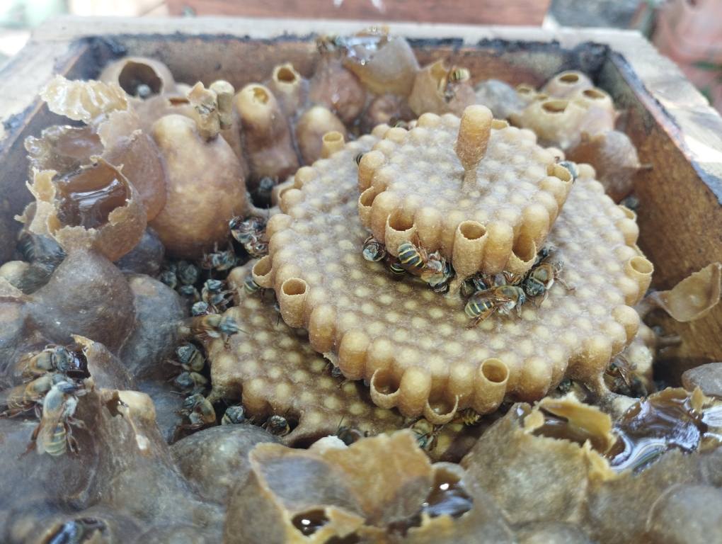 Aufgrund der Fließfähigkeit ihres Honigs bauen diese Bienen keine herkömmlichen Waben, sondern horizontale Strukturen mit kleinen Behältern aus „Cerumen“– einer Mischung aus Wachs und Propolis – in denen sie Honig und Pollen lagern.